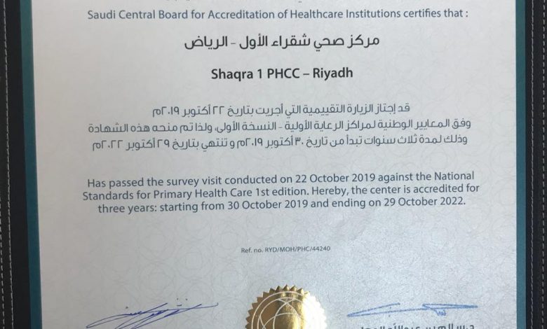 تسلم المركز الصحي الأول بشقراء شهادة الاعتماد من قبل CBAHI المركز السعودي لاعتماد المنشآت الصحية بعد اجتيازة وبتفوق كافة المتطلبات بأعلى المعايير المطلوبة ، وتكمن مهامه في وضع معايير جودة في تقديم الرعاية الصحية وسلامة المرضى التي يتم بموجبها تقييم جميع منشآت الرعاية الصحية لإقامة الدليل على التقيد بتلك المعايير