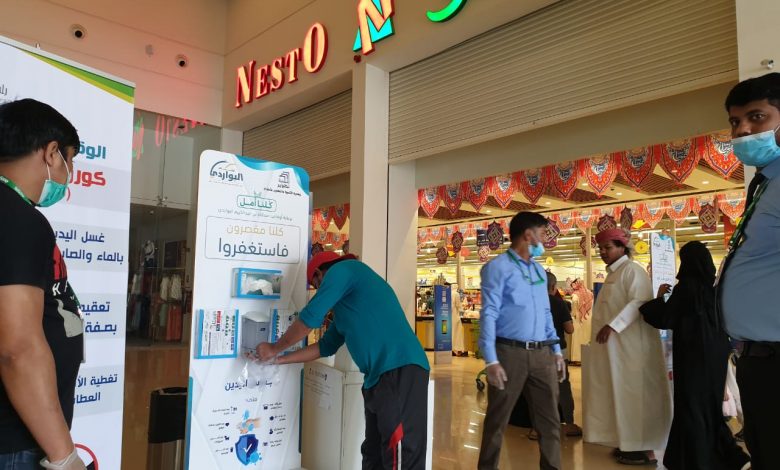 والتي تحتوي على جهاز للمعقم وقفازات و مطويات توعوية إرشادية و عبارات شرعية و صحية