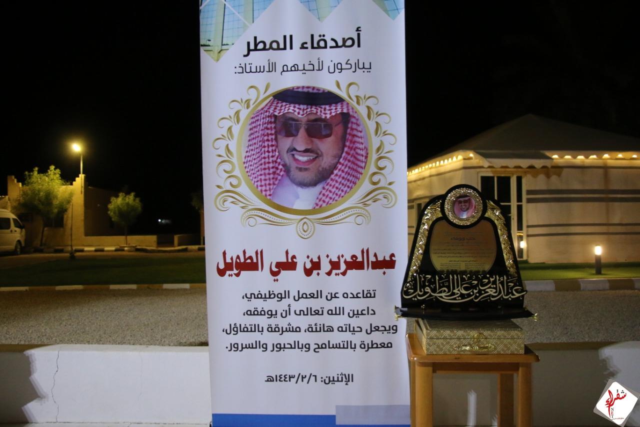 في ليلة بهيّة، متعطرة بوشاح الوفاء.. كرّمت مجموعة أصدقاء المطر بمحافظة شقراء زملاءهم المتقاعدين عن العمل ، فقد اجتمعوا قبل حوالي ٢٤ سنه في قسم النشاط الطلابي بإدارة التعليم بمحافظة شقراء ، وافترقوا في العمل، وبقي التواصل ينثر الاحترام والتقدير والصداقة، وما زال معين اللقاءات يتدفق بمبادرات جمّة.
