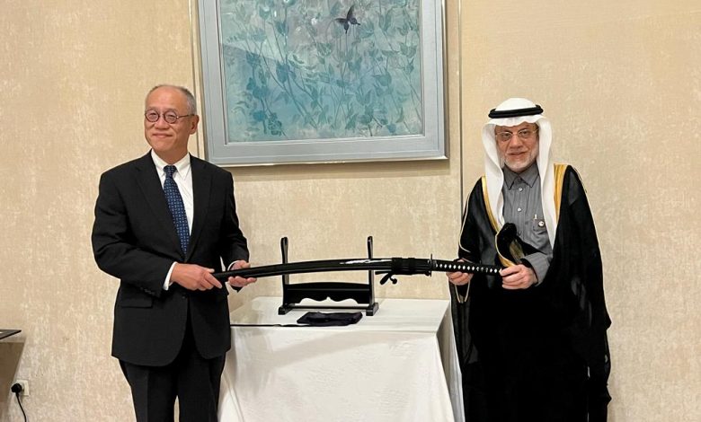 وفي نهاية اللقاء الجميل تم تبادل الهدايا حيث أهدى السفير الياباني للمهندس الفاضل سيف الساموراي وأهداه المهندس الفاضل مجسم لدروازة نجدية أثرية.