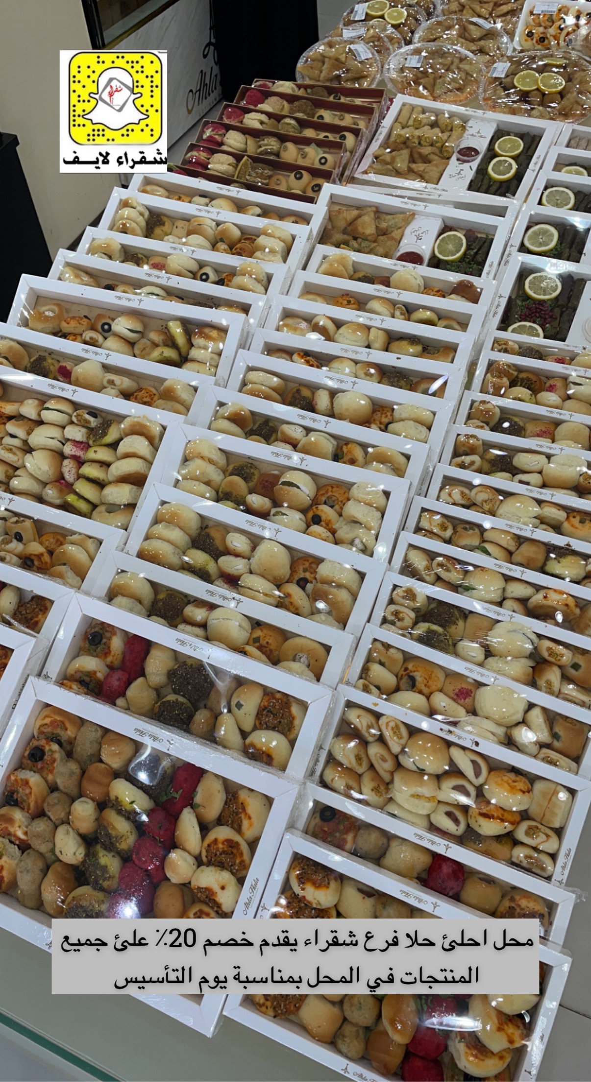 محل احلئ حلا فرع شقراء يقدم خصم 20٪ علئ جميع المنتجات في المحل بمناسبة يوم التأسيس