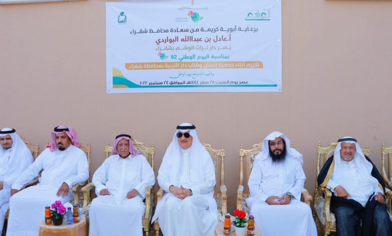 بمناسبة اليوم الوطني السعودي 92 محافظ شقراء يكرم أبناء جمعية إنسان وطلاب دار التربية الاجتماعية بدار تراث الوشم