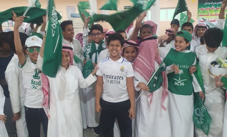 وتزين الطلاب بالزي السعودي رافعين راية التوحيد مرددين ” موطني عشت فخر المسلمين ”