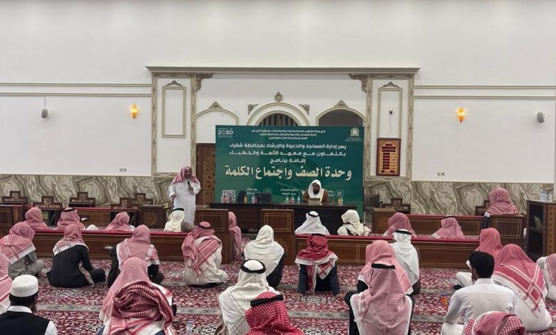 أقام معهد الأئمة والخطباء بالتعاون مع فرع الوزارة بمنطقة الرياض بالتنسيق والترتيب مع إدارة المساجد بمحافظة شقراء ندوة بعنوان ( وحدة الصف واجتماع الكلمة ) القاها الشيخ/ محمد بن رمزان الهاجري
