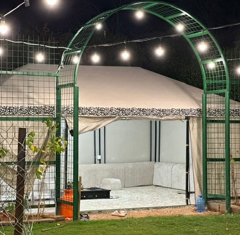 مواصفات الأستراحة حديقة وخيمة بكامل معاميلها مع وجار حاتم ومجلس كبير ومطبخ ودورة مياه اكرمك الله