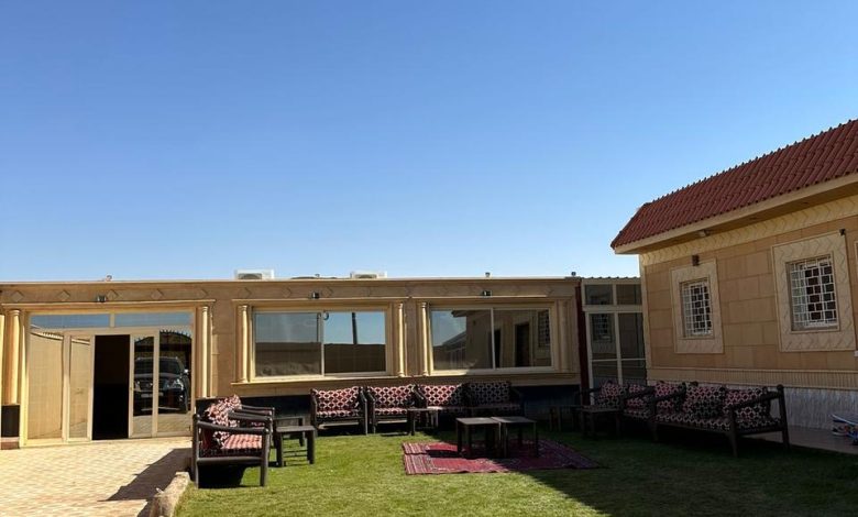 ومجالس واسعه كنب تشيل اكثر من ٤٠ شخص وصالة طعام مجهزه بالطاولات والكراسي ومسطحات خضراء وجلسات خارجيه والعاب للاطفال ومطابخ نظيفه ومجهزه