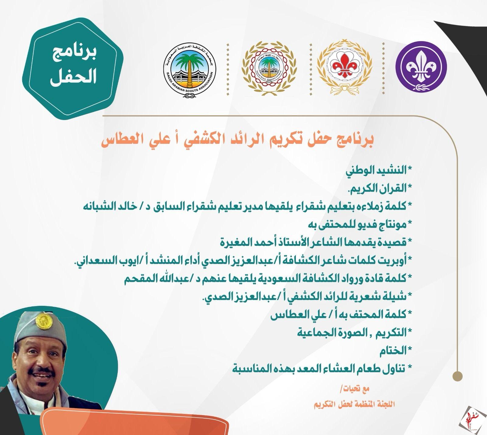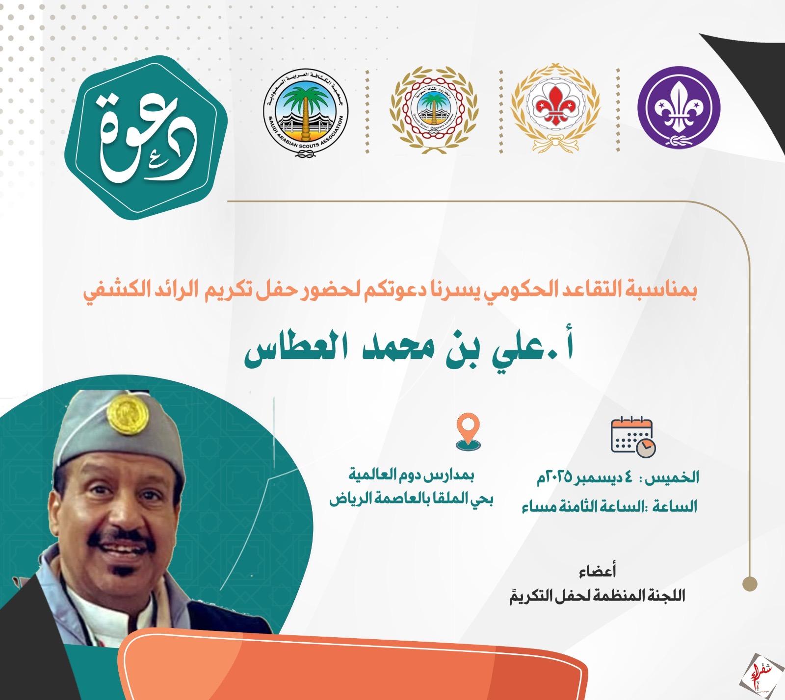 أقام رواد الكشافة السعودية حفلًا تكريميًا للأستاذ علي بن محمد العطاس، وذلك بمناسبة تقاعده عن العمل الحكومي، تقديرًا لما قدمه طوال سنوات خدمته من عطاء وإخلاص ومسيرة حافلة بالإنجازات.